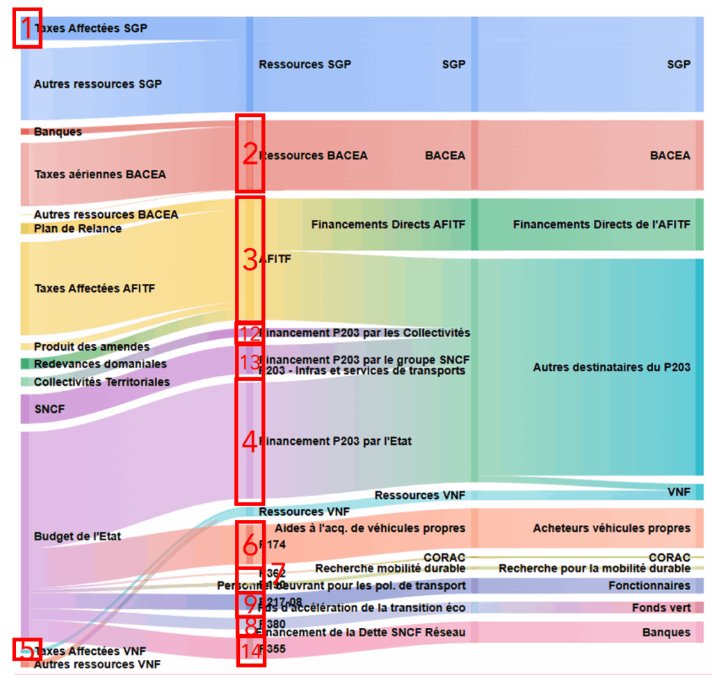 - Éléments notables : On observe une forte croissance des montants alloués à des catégories telles que le financement de l’AFITF, les taxes affectées aux Voies Navigables de France (VNF), et l’acquisition de véhicules propres.